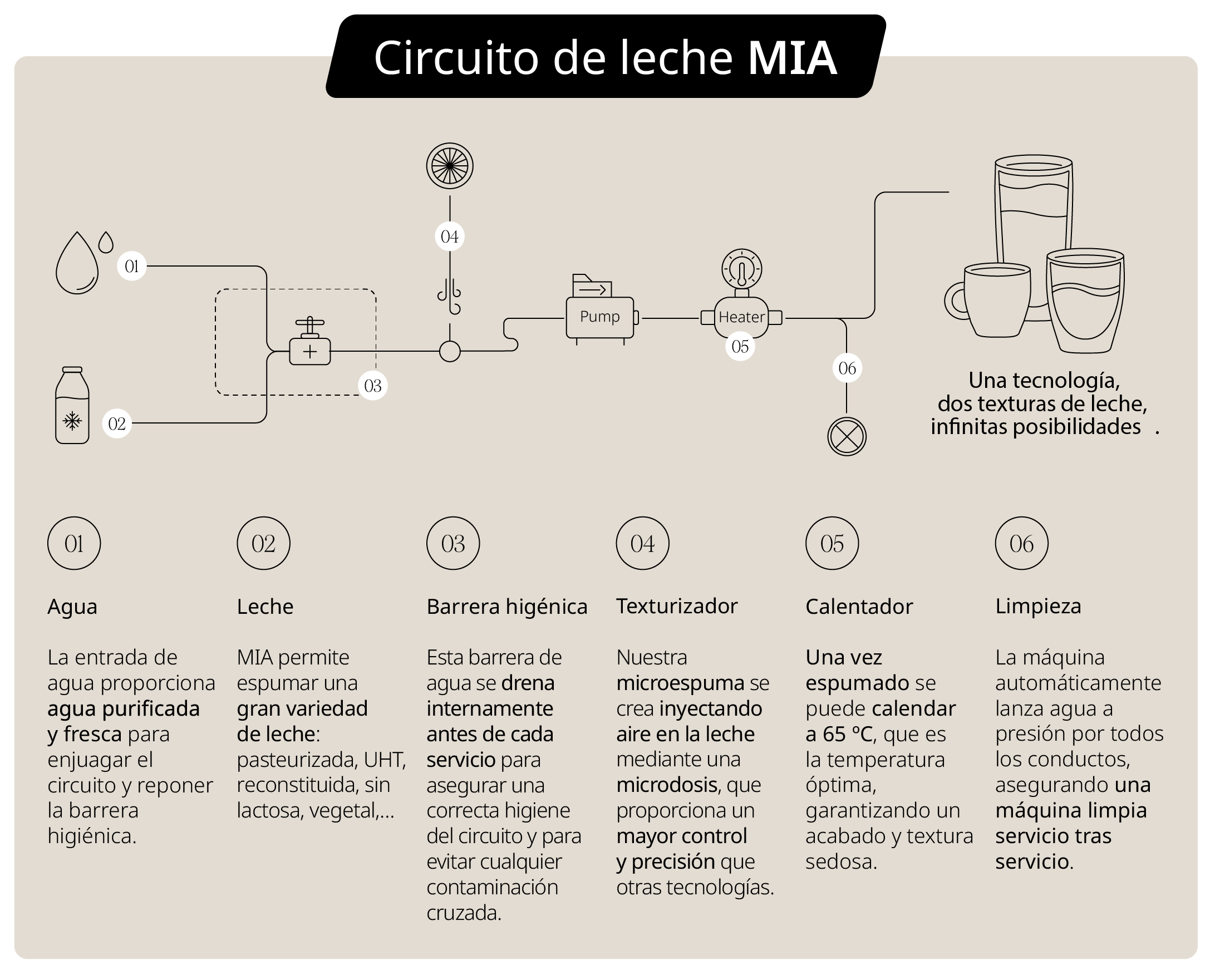 La innovadora tecnología de microinyección de aire (MIA) para leche fresca y leche en polvo inyecta aire a alta presión, creando millones de burbujas que generan una textura aterciopelada y consistente.